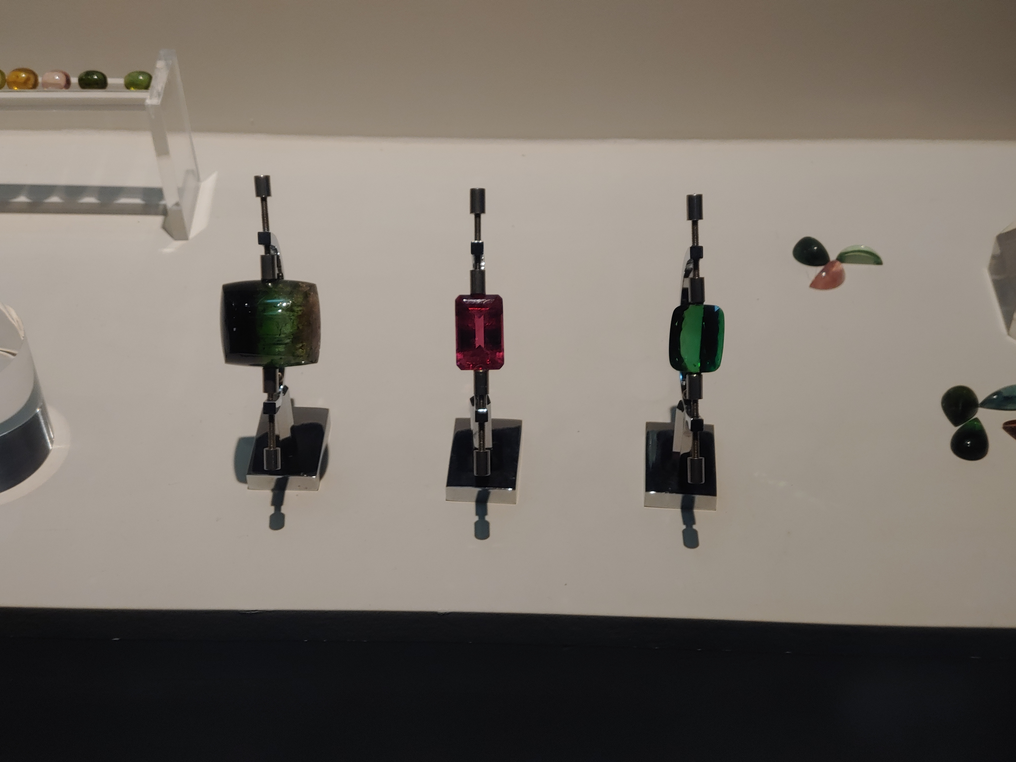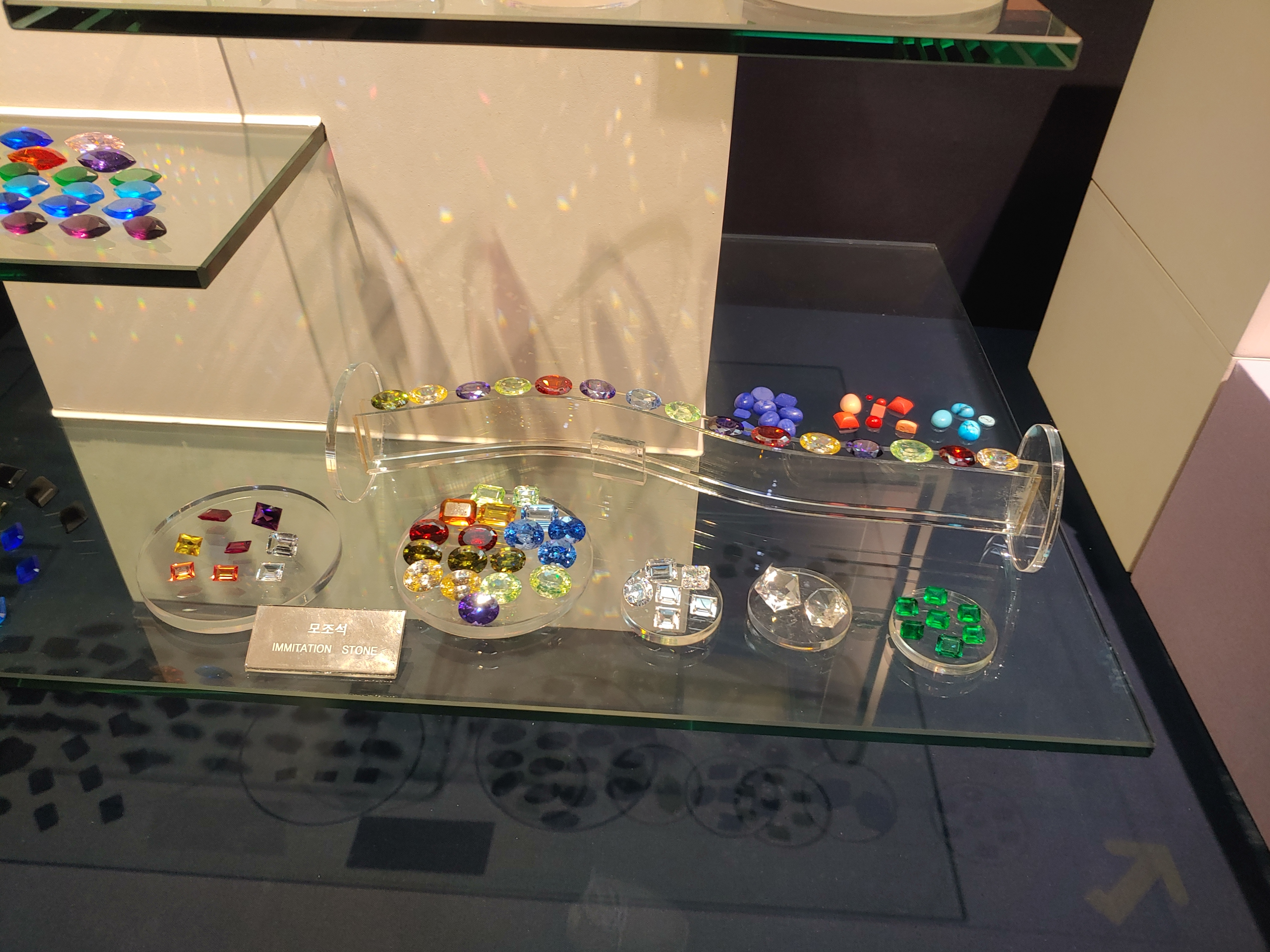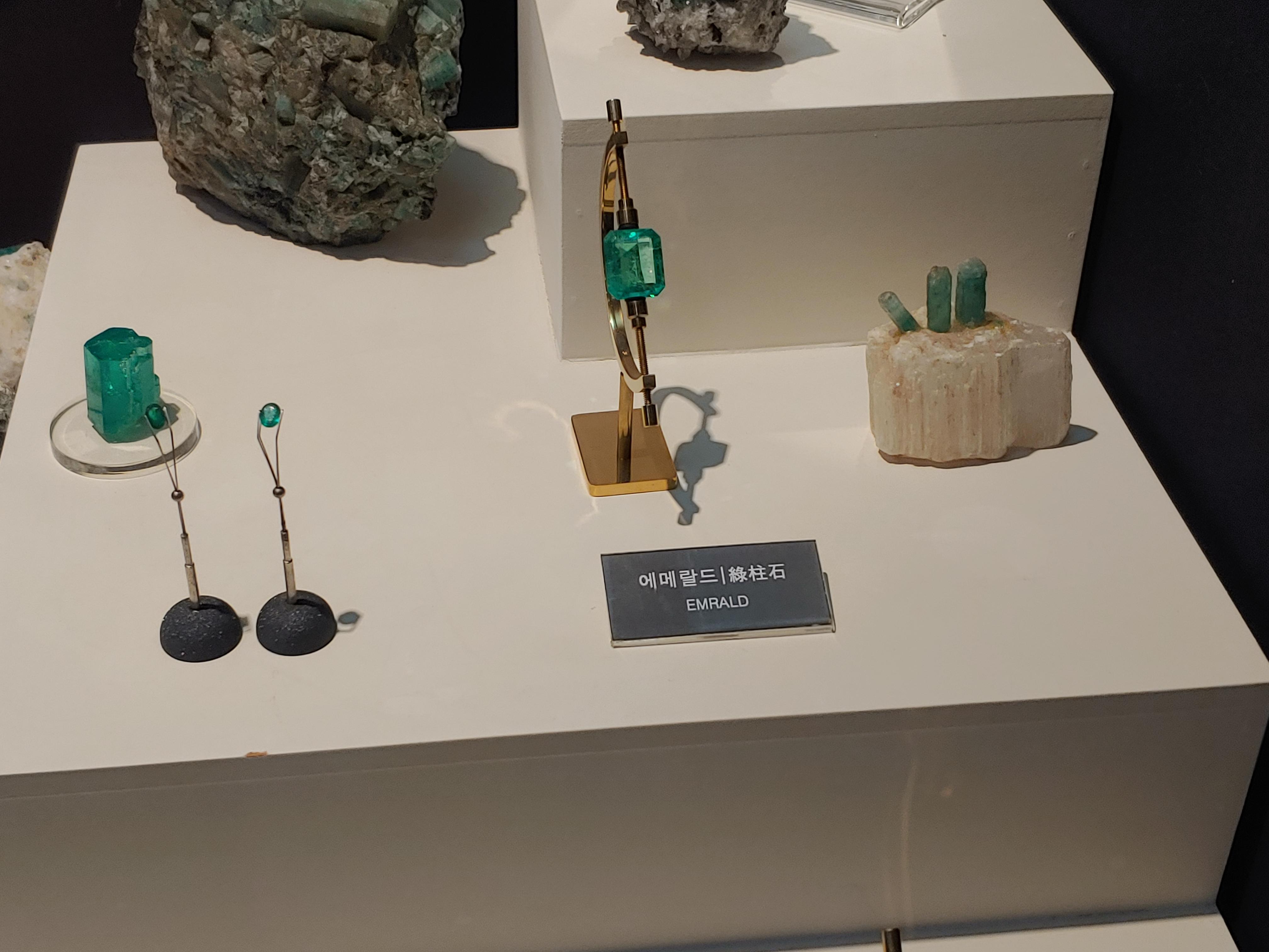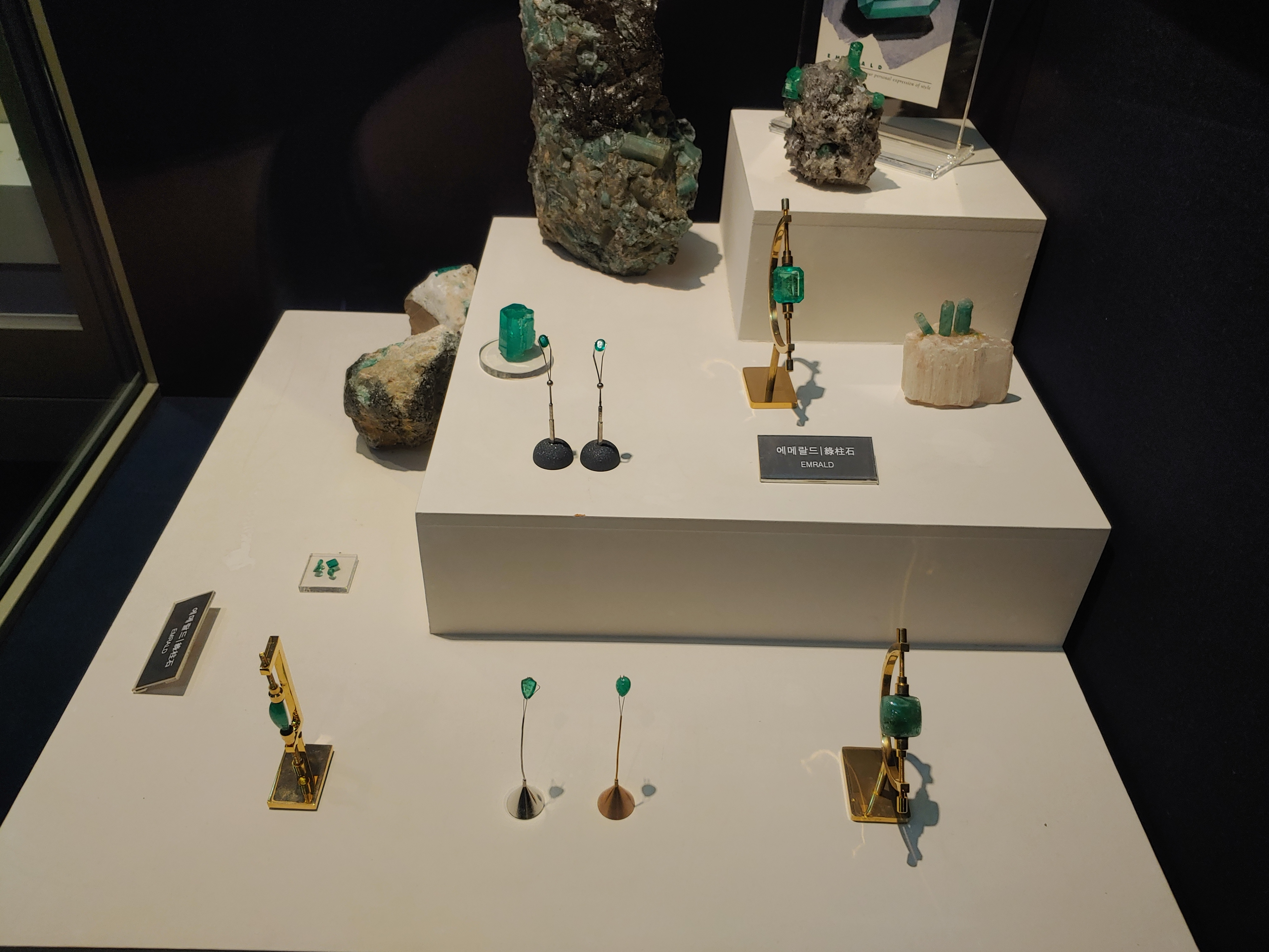 여러 보석 들을 종류별로 모아서 한 곳에 원석과 세공품을 같이 전시하고 있다.