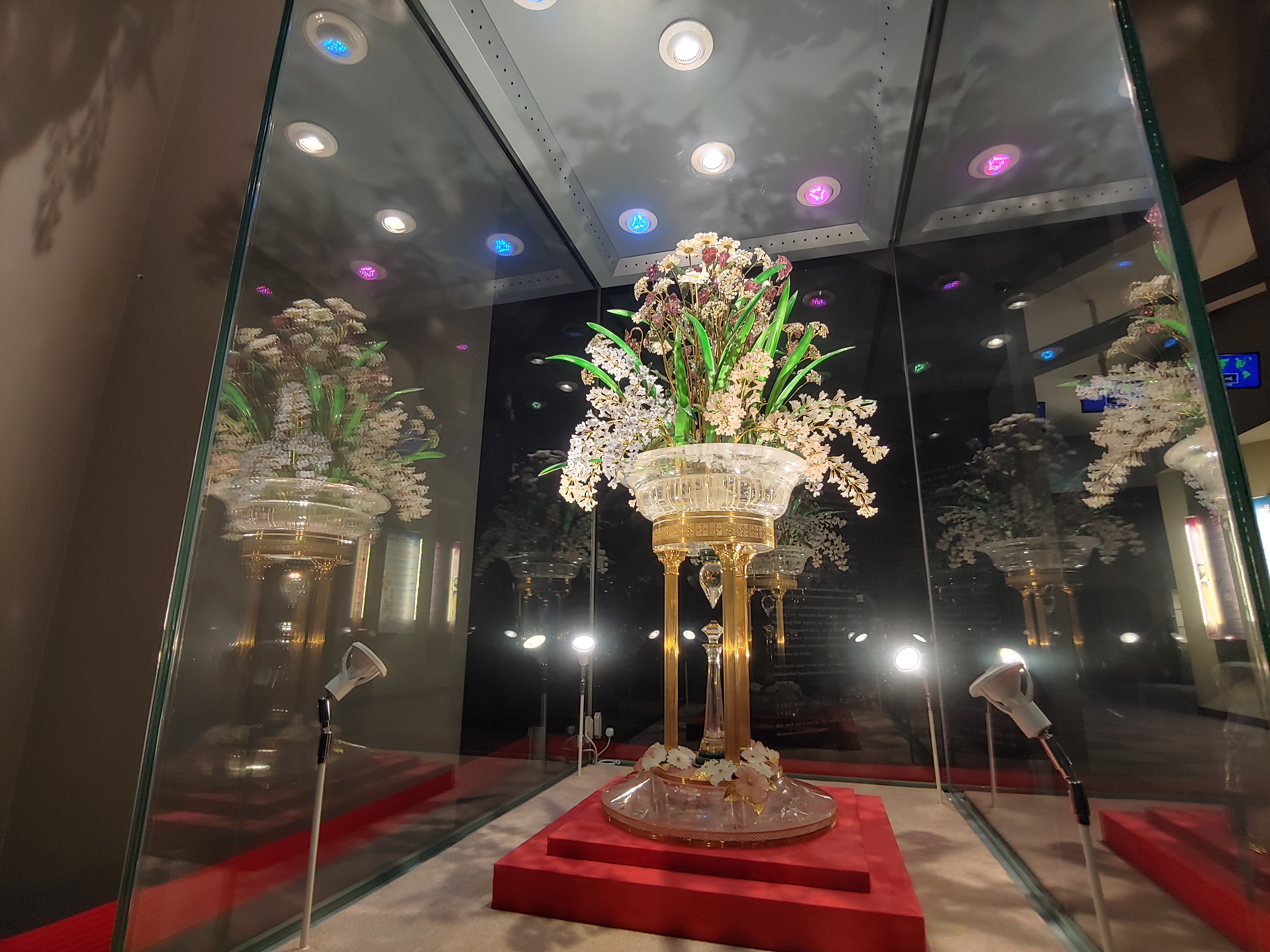 꽃이 얹어져 있는 저 그릇비슷한것은 백수정을 가공해서 만든 것이고 그아래에 있는 대좌는 18K 금이고, 2천 개도 넘는 꽃송이가 보석으로 만들어졌다고 한다.