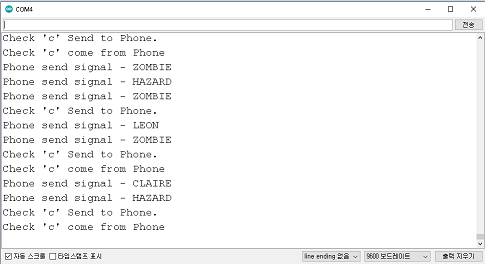 그래서 아두이노 코드의 다른 잡신 호인 LEON, CLAIRE, ZOMBIE, HAZARD들이 들어왔을 때도 c가 들어왔을 때와 동일하게 isThereCheckSignal라는 변수를 true로 세트 해줍니다.