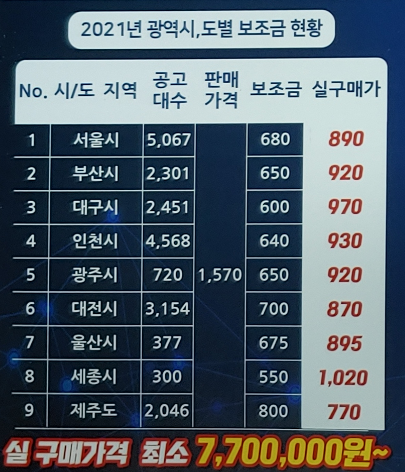 차량의 기본 가격 1570만원, 각 시도별 보조금에 따라 어느 정도 보정이 되고 있네요.